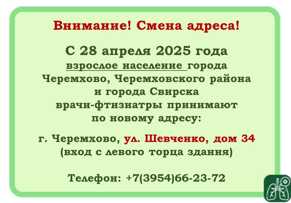 Врачи-фтизиатры Черемховского филиала принимают взрослое население Черемховского района, городов Черемхово и Свирска по новому адресу.